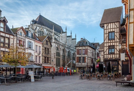 Un dédale de ruelles pavées dévoile un ensemble exceptionnel de maisons colorées à colombages du XVIe siècle.